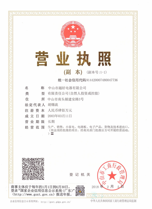 中山市越好电器有限公司(BETTER 越好),自 1999 年创立,扎根广东中山南头,服务全球,二十余年专注于专业电磁厨电研发、设计与制造,持续为海内外合作伙伴与用户提供优质产品与服务,享誉机电制造行业, 荣获“中国电子家电出口百强企业”、“中国十大烟灶热产品出口企业“、“中国外贸出口先导指数样本企业”, “中国电磁炉优选品牌”、“广东省高新技术企业”、“广东省专精特新企业”、“中山市级企业技术中心”、“中山市贸促会推荐企业”、“中山市级企业技术中心”、“A 级纳税企业”、“AA 级信用企业”。