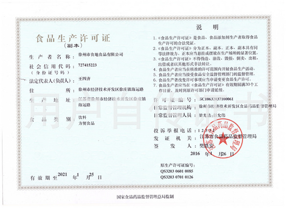 徐州市食地食品有限公司成立于2001年,座落在江苏北部,苏、鲁、豫、皖四省交界处,徐州市经济技术开发区徐庄镇海运路,主要生产酸梅粉、奶茶、咖啡、冰淇淋粉、果汁、果酱、布丁、奶昔、姜汤、甜橙、果C、五谷豆浆、五谷杂粮。 本企业已通过ISO9001:2008质量管理体系认证,ISO22000:2005食品安全管理体系认证,取得食品生产许可证SC认证。 徐州市食地食品有限公司,以“发展民族品牌”为己任,“质量第一”为经营理念,以超常规的思维、超常规的创意、超常规的行动,经过数十年的努力,现经销商和终端客户已遍布全国各地,已成为中国食品行业做高竞争力的开拓者,食地人的激情和智慧为创建一个具有竞争优势的国内食品行业而不懈努力!