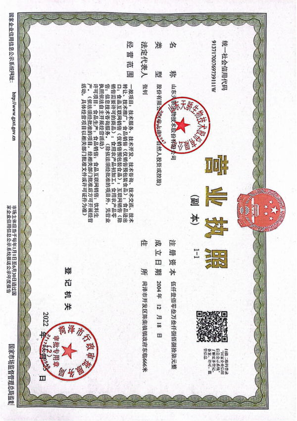 山东天骄生物技术股份有限公司是专业致力于食品配料研发、生产和销售于一体的国家级高新技术企业,企业始建于2004年,专注健康食品配料行业20年,下辖三家子公司,拥有1个山东省植物性多肽工程技术研究中心,2个省级企业技术中心,1个市级重点实验室;授权专利56项,其中发明专利15项;与制定了《软冰淇淋预拌粉》国家标准、《特殊医学用途配方食品用脂肪粉》等多项团体标准;现具有年产各种粉末油脂10万吨、脂质(微囊)粉5万吨、植物基系类产品3万吨、固体饮料2万吨的生产规模。