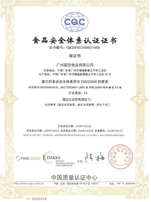 一直以来,我们秉承“优质、专业、安全”的经营理念,不断优化产品质量,追求客户价值的超越和提升,坚持与国际接轨的全过程、全方位的质量管理体系。目前公司产品已通过SC﹑ISO22000:2018﹑HACCP、FSSC22000、SEDEX和出口卫生注册认证,同时公司自行研发制造的甜筒生产线相应通过了CE认证。