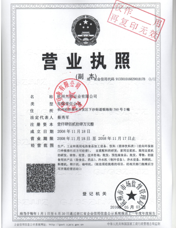 杭州九阳豆业有限公司成立于2005年,源于九阳豆浆机发明人王旭宁先生“豆浆健康世界”的情怀, 秉承“全心全意为顾客提供一杯好豆浆”的使命,经过多年的创新研发,推出多种好豆浆解决方案。 针对财政食堂和高端餐厅推出了“健康食堂及餐厅标配——九阳商用豆浆机”;针对快捷餐饮推出了 “好机+好料=好豆浆”的精磨豆浆解决方案;针对潮流时尚消费推出了即饮豆浆九阳豆浆“磨豆匠”。 好豆浆,九阳做!九阳豆业是好豆浆解决方案的专家。 杭州九阳豆业有限公司拥有东北非转基因优质大豆种植基地和大豆深加工基地,打造了九阳豆浆全产业链优势平台。 目前,九阳豆浆拥有300多家合作伙伴,服务网络覆盖全国260个大中城市。九阳豆业将和更多的合作伙伴一起, 让更多的顾客喝到一杯好豆浆。