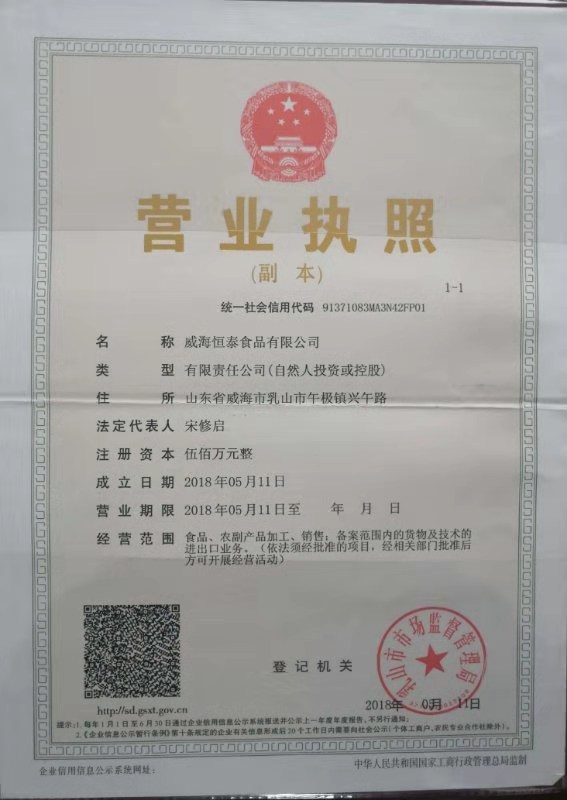 一概述:威海恒泰食品有限公司成立于2018年5月,公司位于山东省威海市乳山市午极镇兴午路377号,注册资金500万元。主要从事食品、农副产品深加工、销售。投资6000万元建设生产NFC及果蔬深加工产品生产项目,年产量在8000吨以上。