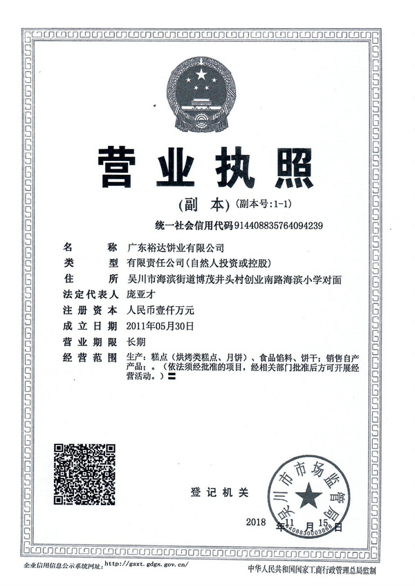 公司产品裕达大月饼以“伍仁金腿月饼”为主打品牌,已获得“中华人民共和国地理标志保护产品”,其传统生产技艺获得“广东省非物质文化遗产”,获得“2021中国烘焙行业OEM杰出品牌”奖,本企业通过ISO22000及FSSC22000 食品安全管理体系认证,曾连续几年获得中国(吴川)月饼文化节金质奖。