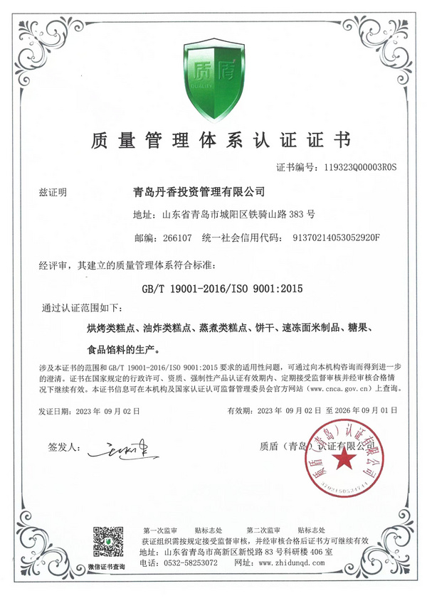 青岛丹香投资管理有限公司是山东省规模最大的烘焙企业,山东省食品安全示范企业。企业始创于1996年,是一家以生产蛋糕、面包、点心以及节日礼品为主,集研发生产为一体的现代化烘焙企业,总部位于青岛。中央工厂占地面积50亩,通过 ISO9001 质量管理体系、22000食品安全管理体系、14001环境管理体系等认证。