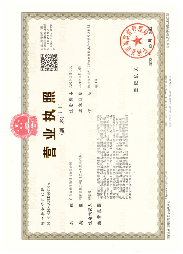 广东兴珠生物科技有限公司成立于2021-11-22,法定代表人为赖摇铃,注册资本为5000万元,统一社会信用代码为91441426MA58D6HT6A,企业注册地址位于梅州市平远县石正镇高新技术产业开发区科创路11号,所属行业为科技推广和应用服务业,经营范围包含:一般项目:生物基材料技术研发;货物进出口;食品销售(仅销售预包装食品);食用农产品初加工;农副产品销售;初级农产品收购;食用农产品零售;食用农产品批发;食品添加剂销售;会议及展览服务;运输货物打包服务;装卸搬运;包装服务;保健食品(预包装)销售;广告发布;技术服务、技术开发、技术咨询、技术交流、技术转让、技术推广。(除依法须经批准的项目外,凭营业执照依法自主开展经营活动)许可项目:食品生产;食品销售;食品互联网销售;食品用纸包装、容器制品生产;道路货物运输(不含危险货物)。(依法须经批准的项目,经相关部门批准后方可开展经营活动,具体经营项目以相关部门批准文件或许可证件为准)。广东兴珠生物科技有限公司目前的经营状态为在营(开业)企业。